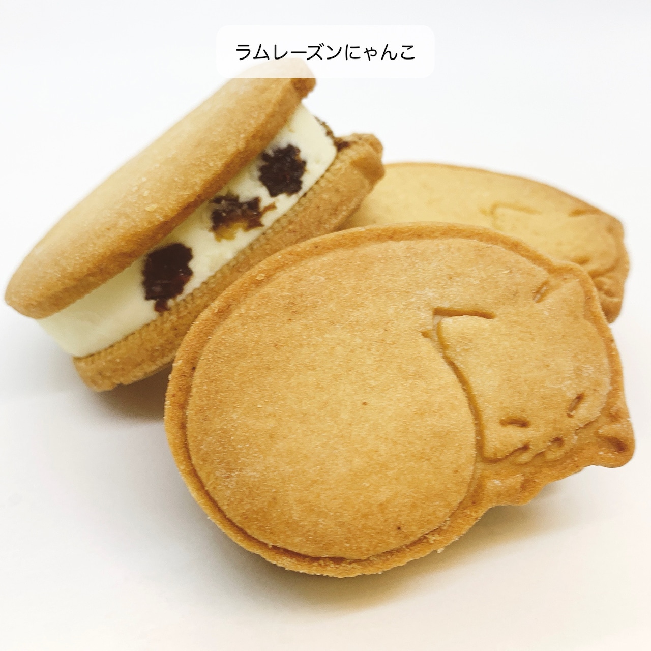 北海道産バターをたっぷり使用したクリームと、自家製のラムレーズンを、可愛らしい猫のクッキーでサンドしました。
