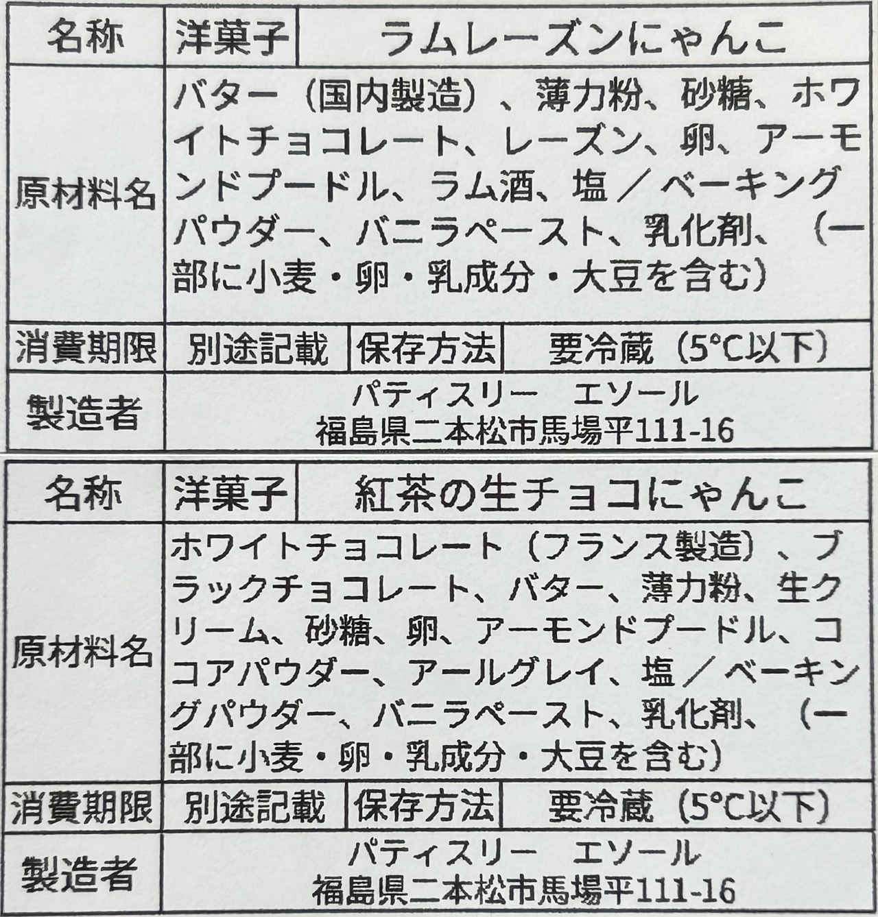 ①ラムレーズンにゃんこ・紅茶の生チョコにゃんこ各3個 6個入り